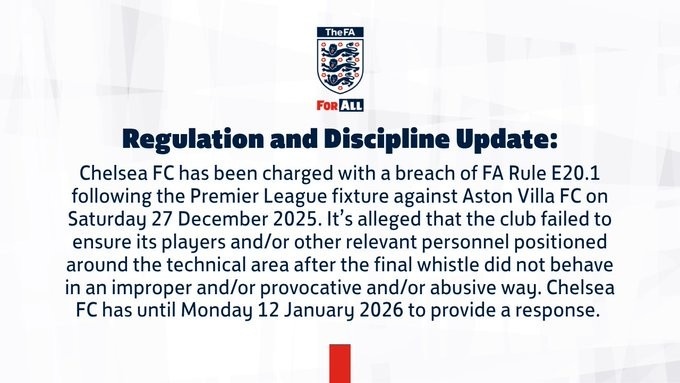 切尔西需在2026年1月12日周一之前就此次指控作出正式回应。